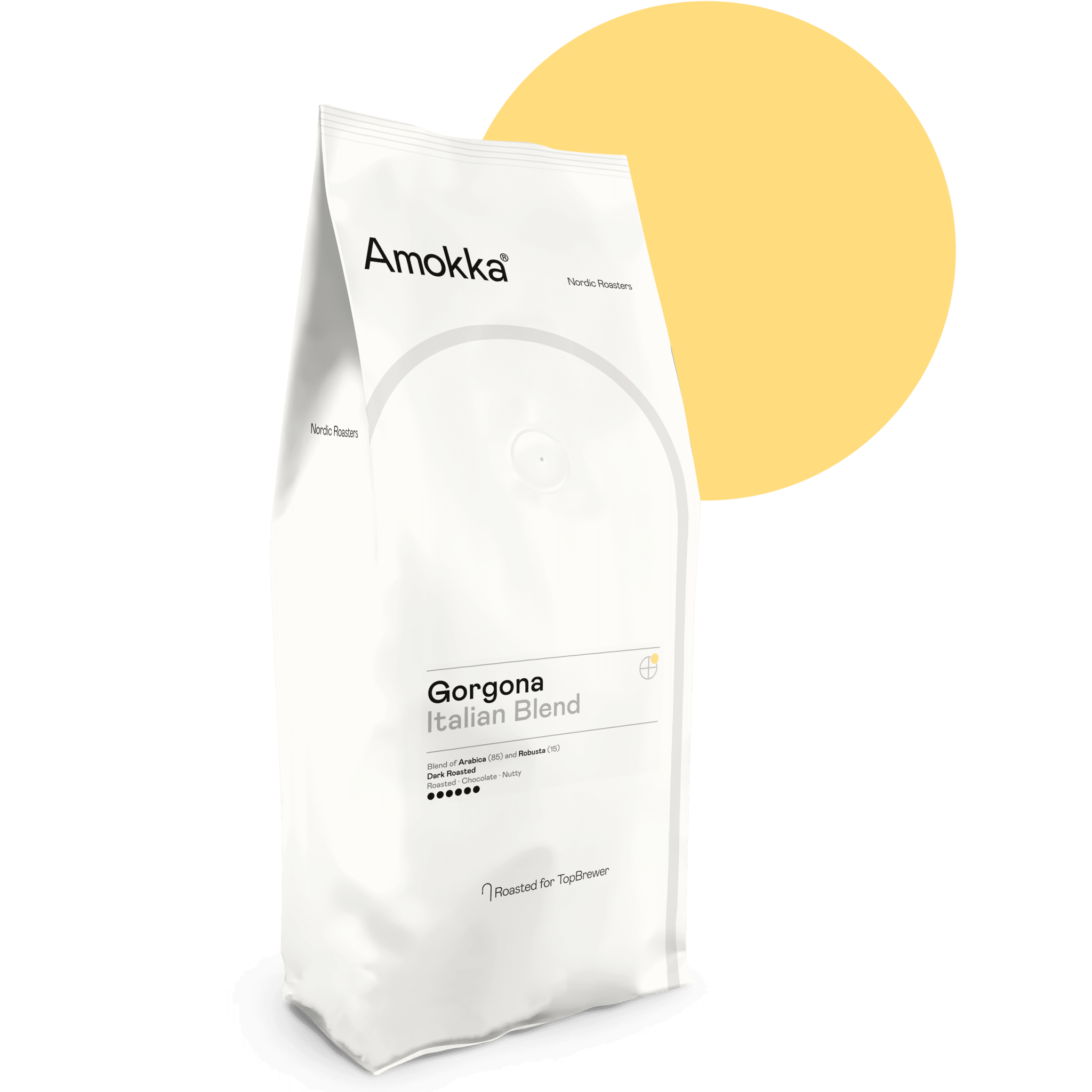 תערובת איטלקית זו כוללת 85% פולי ערביקה שנבחרו ביד מברזיל וניקרגואה ו-15% פולי רובוסטה איכותיים מאוגנדה. אנו קולים אותם בקלייה כהה עם זמן פיתוח ארוך כדי להדגיש את הטעמים. תקבלו טעמים של קלייה שוקולד ואגוזים עם קפה גורגונה מבית Amokka® קלוי במיוחד עבור TopBrewer.